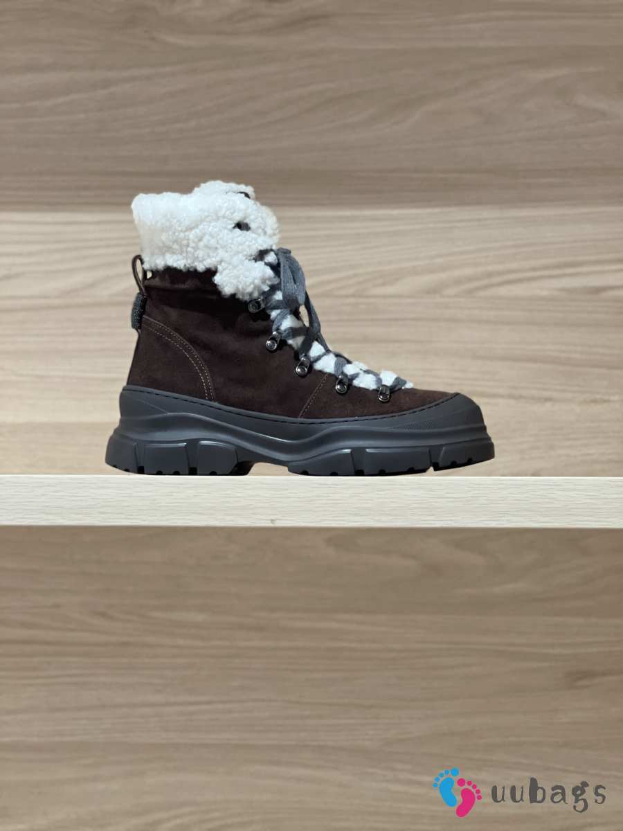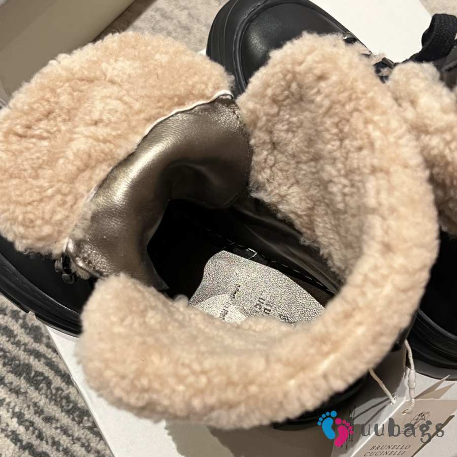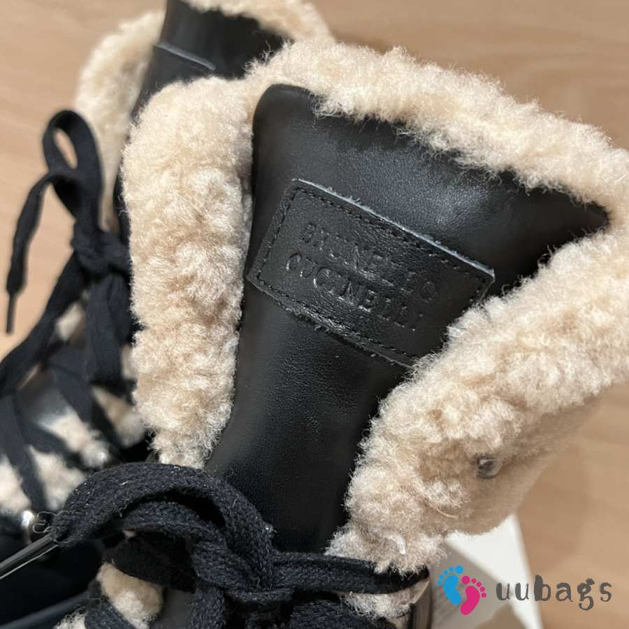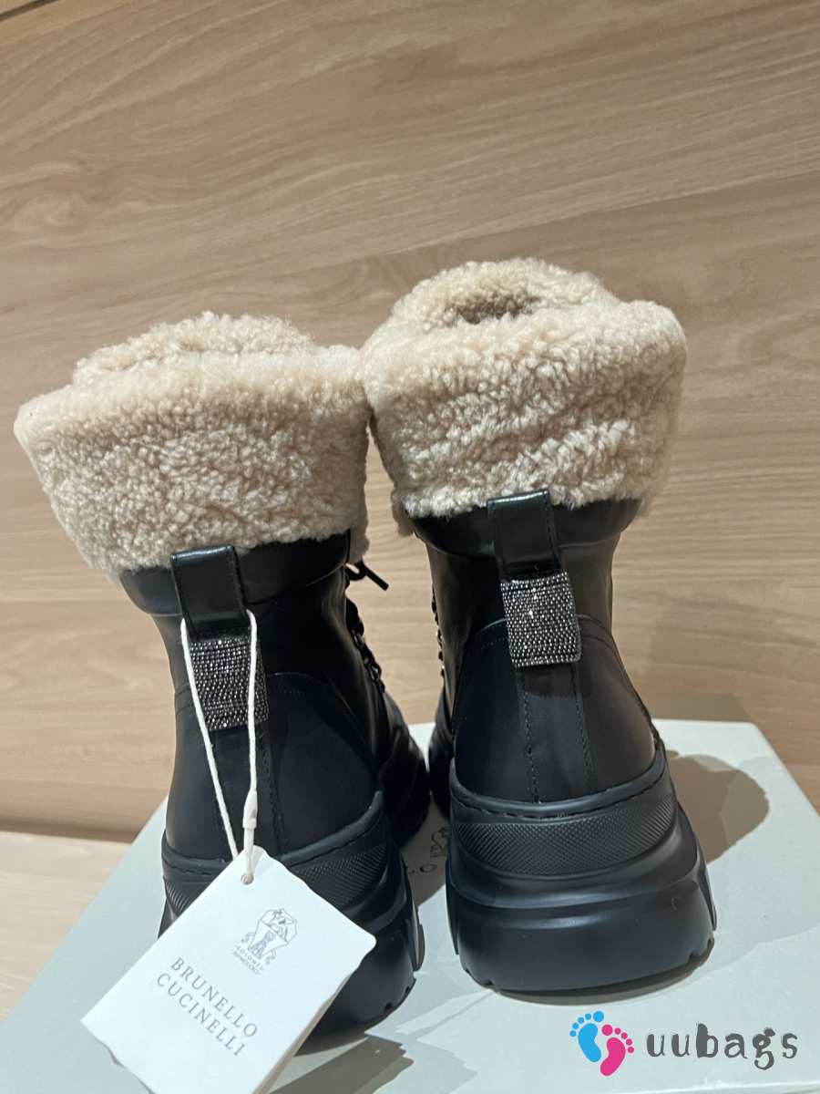 Uubags Brunello Cucinelli Classic Black Leather Mountain Boots with Fuzzy Shearling Lining and Precious Contour