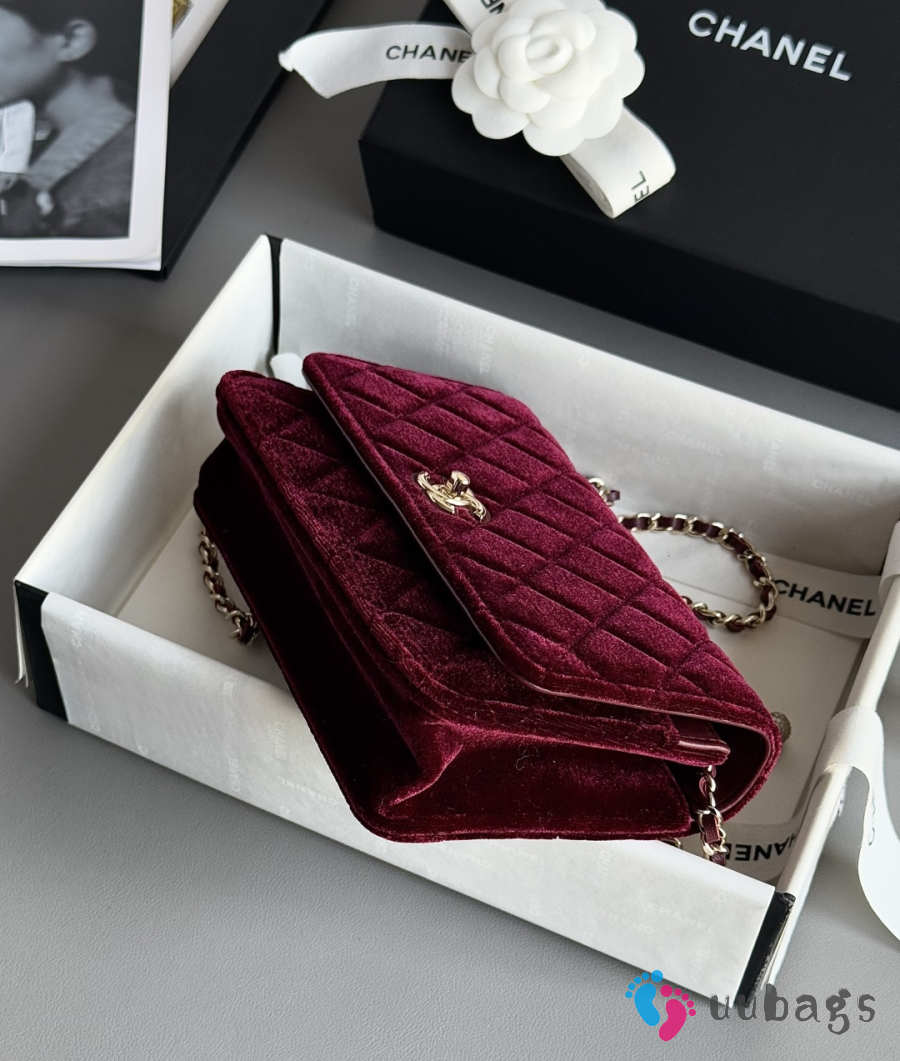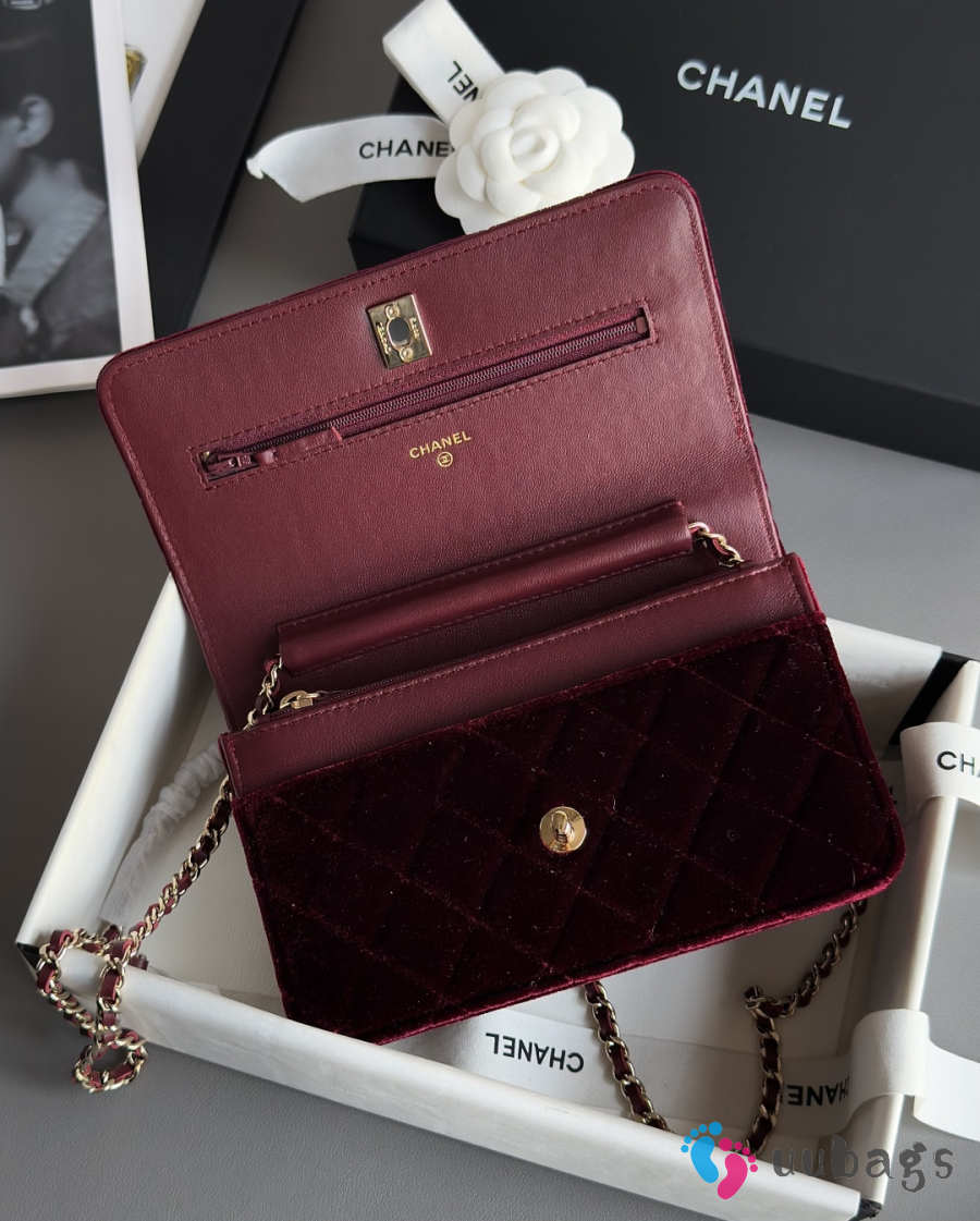 Uubags Chanel 25A Pearl Crush wallet on chain in burgundy quilted velvet 12.3x19.2x3.5cm