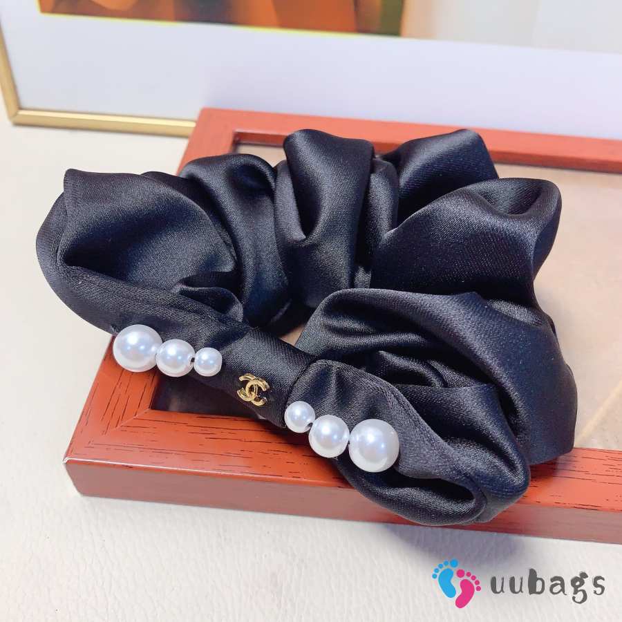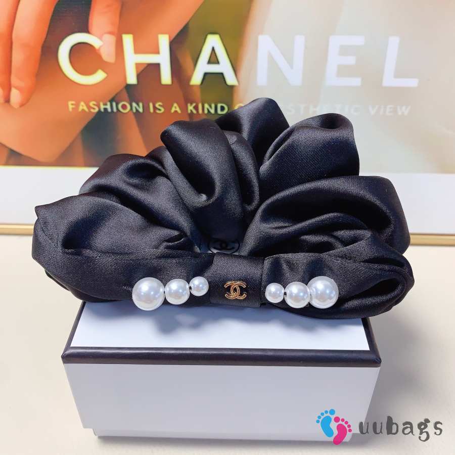 Uubags Chanel Black Satin Scrunchie with Pearl Accents
