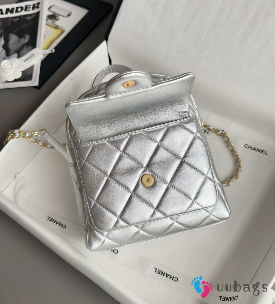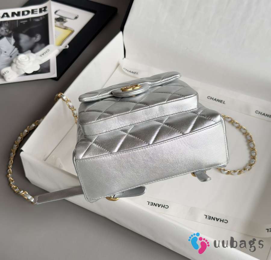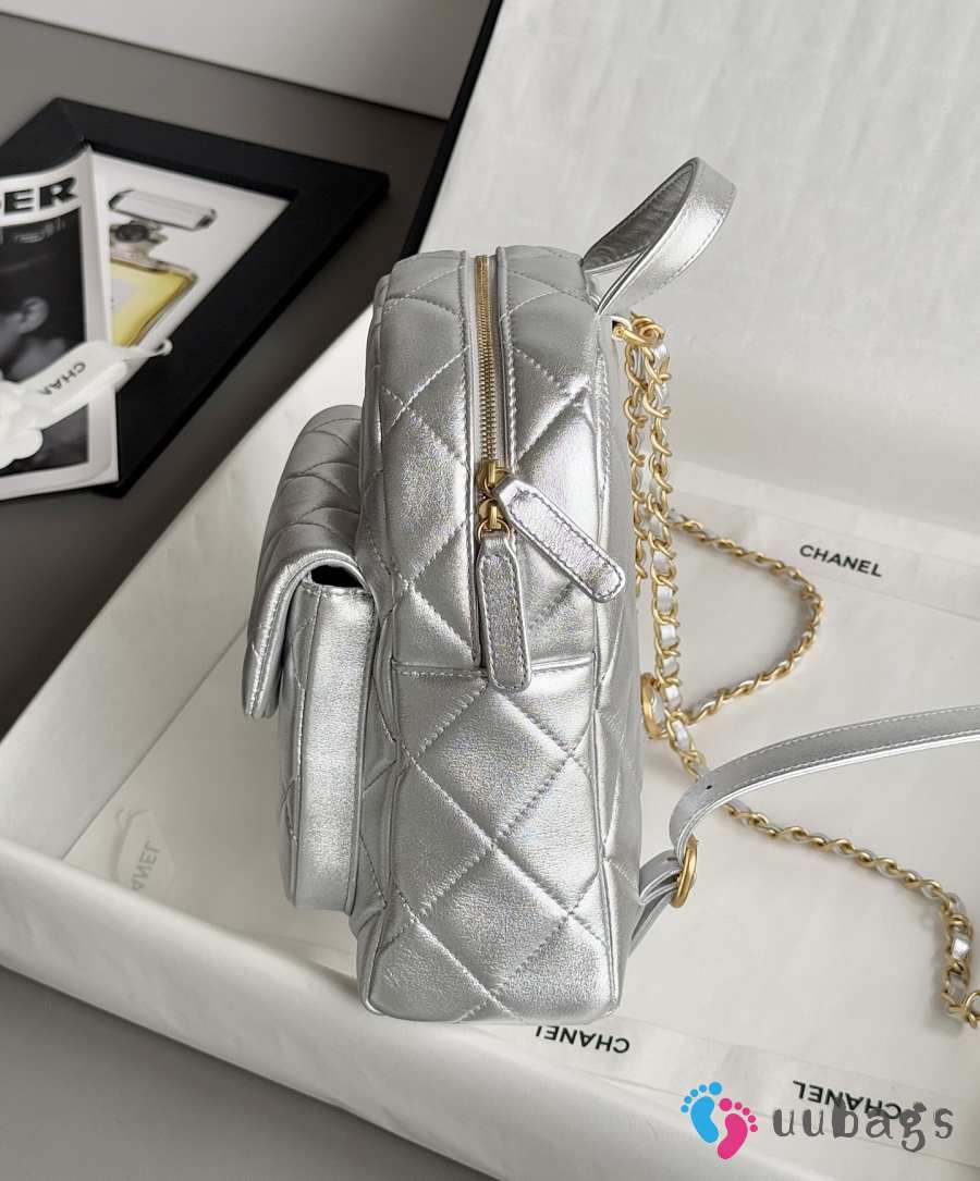 Uubags Chanel Duma backpack in silver metallic lambskin with gold hardware 22x22.5x8.5cm