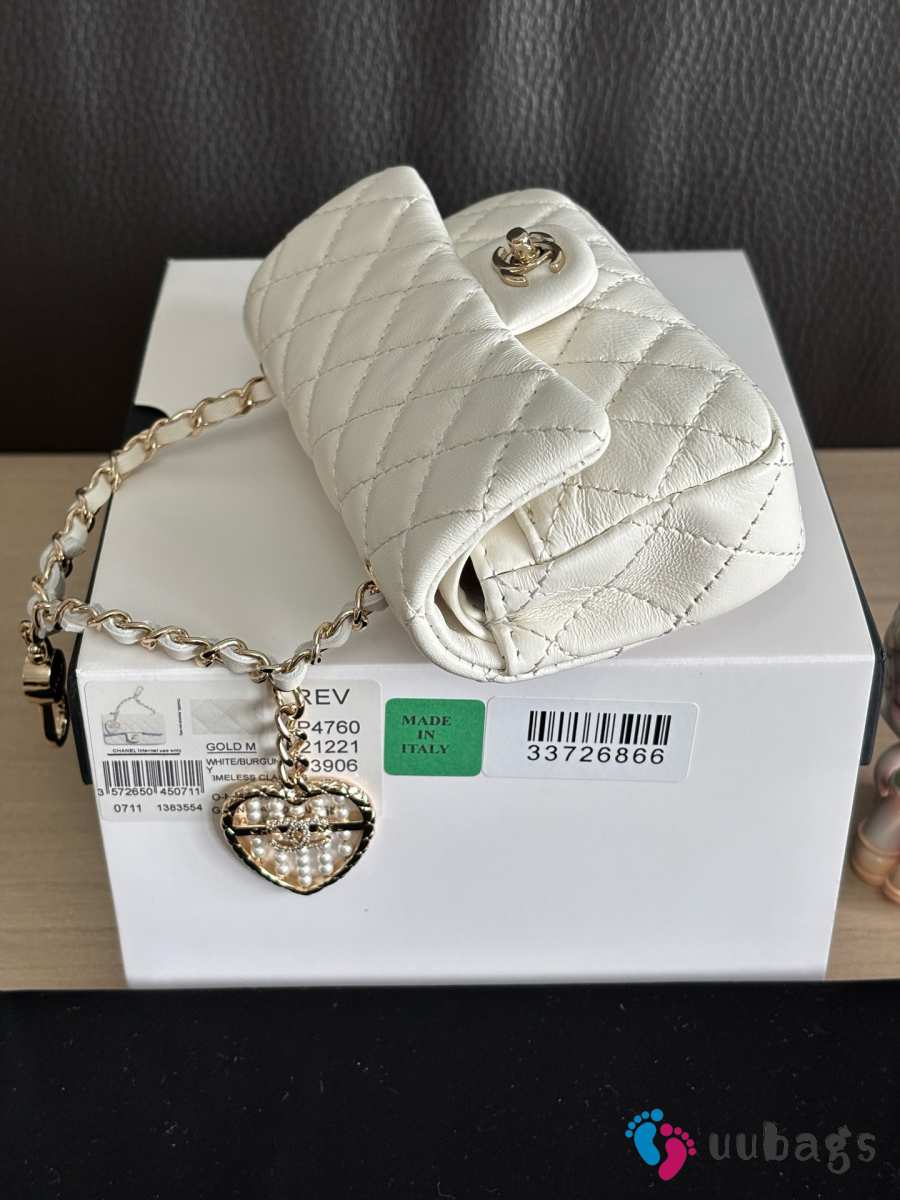 Uubags Chanel Mini Top Handle Flap Bag with Bow Charm White Quilted Leather & Gold-Tone Metal 20x13x9cm
