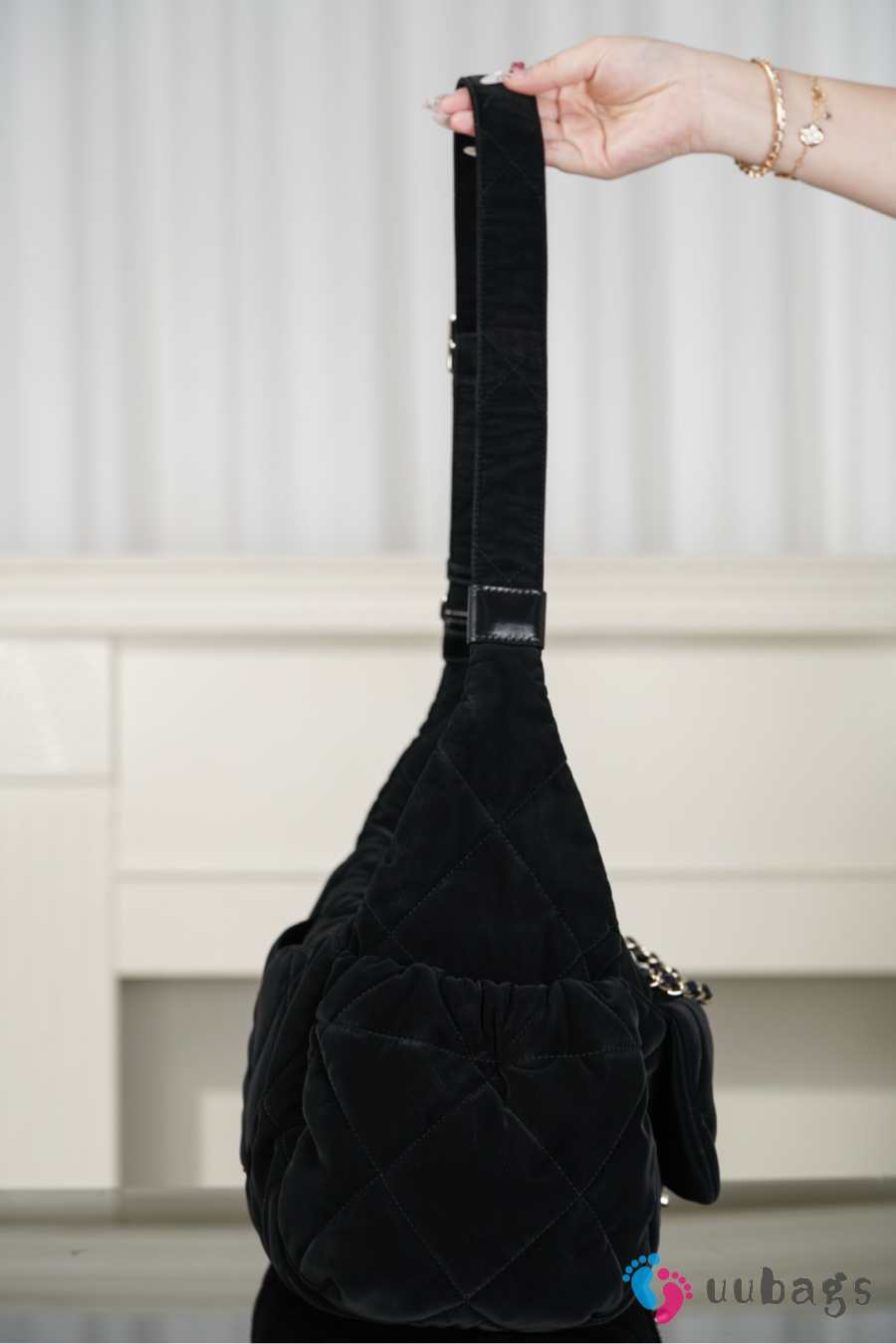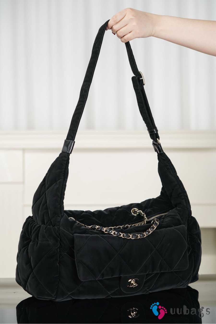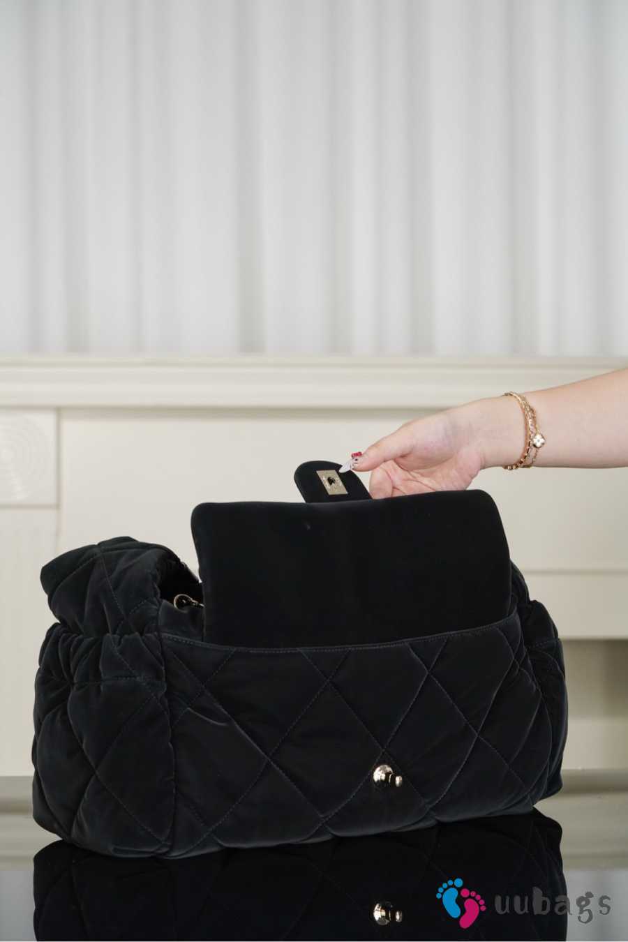 Uubags Chanel Maxi Bowling Bag Velvet Effect Nylon & Gold Metallic In Black 22x44x18cm
