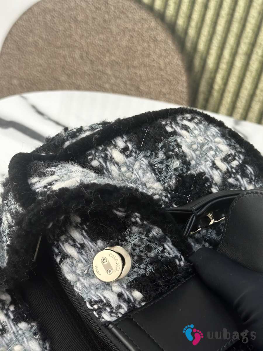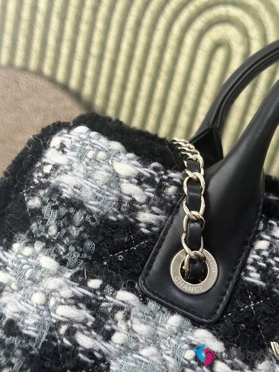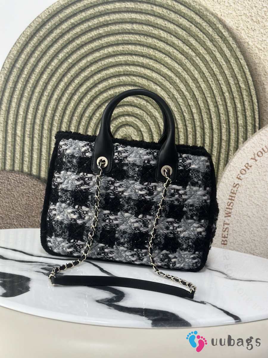 Uubags Chanel Medium Shopping Bag Tweed, Shearling Lambskin & Gold-Tone Metal In Black & Gray 33cm