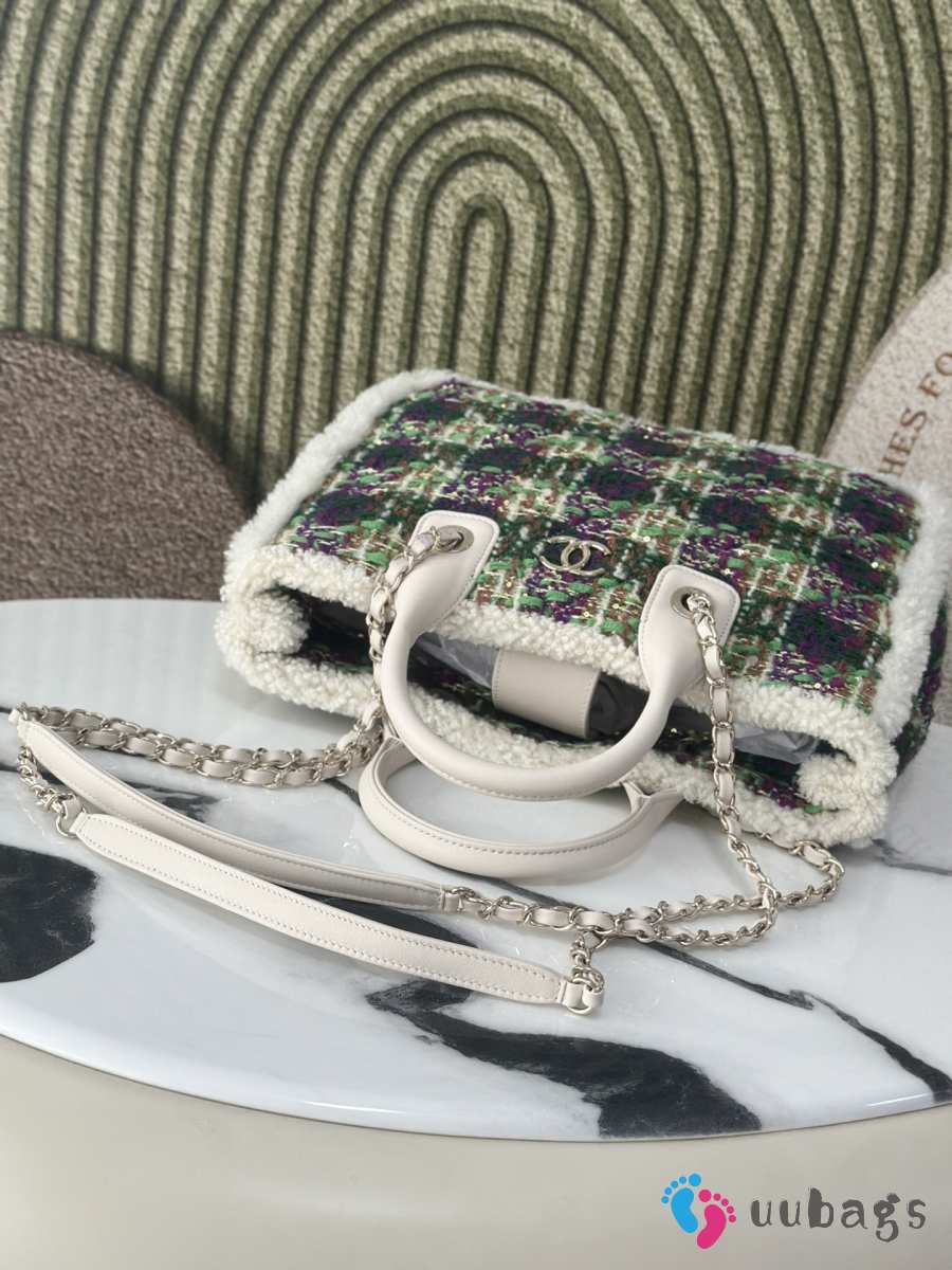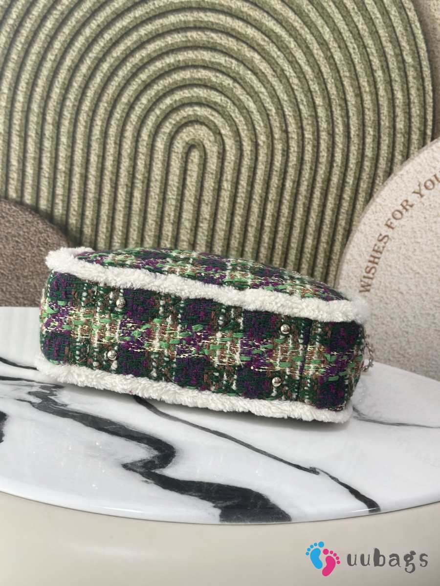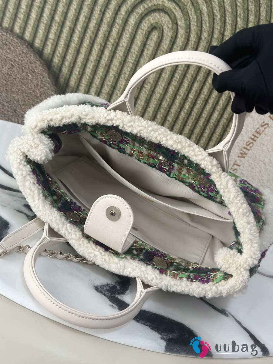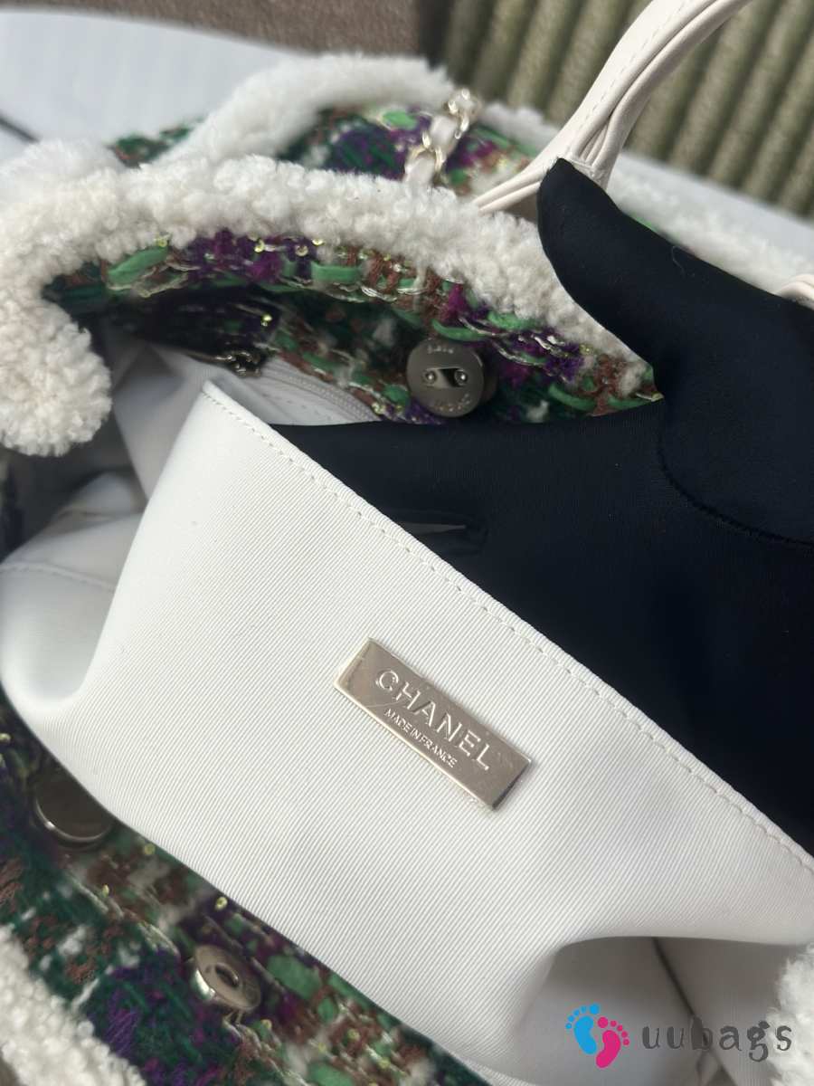 Uubags Chanel Medium Shopping Bag Tweed, Shearling Lambskin & Gold-Tone Metal In Green & Purple 33cm