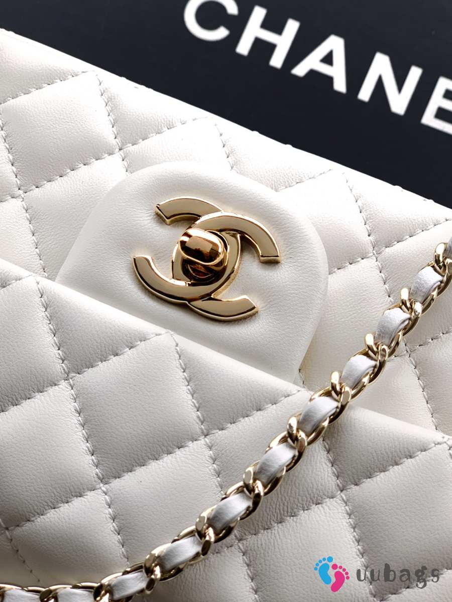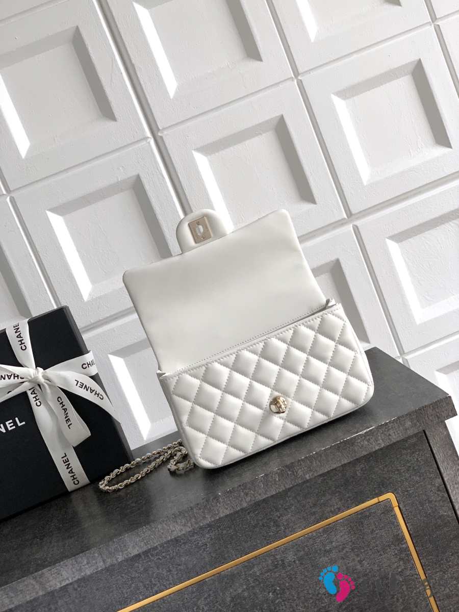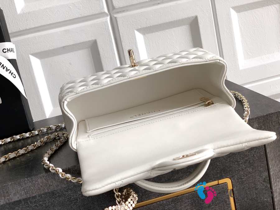 Uubags Chanel Mini Top Handle Flap Bag with Bow Charm White Quilted Leather & Gold-Tone Metal 20x13x9cm