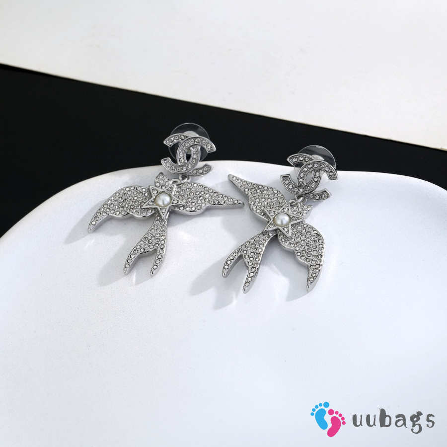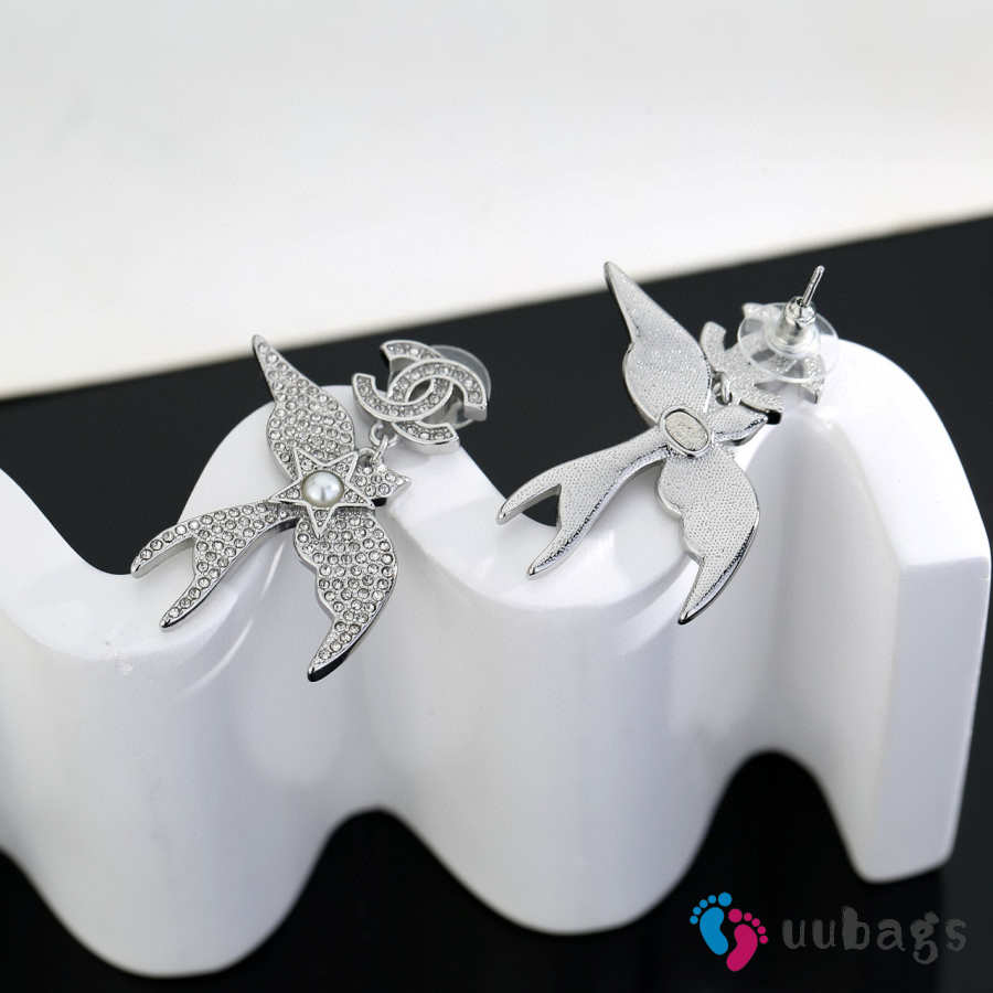 Uubags Chanel Silver-Tone Metal Bird & Star CC Dangling Earrings with Crystals and Pearls