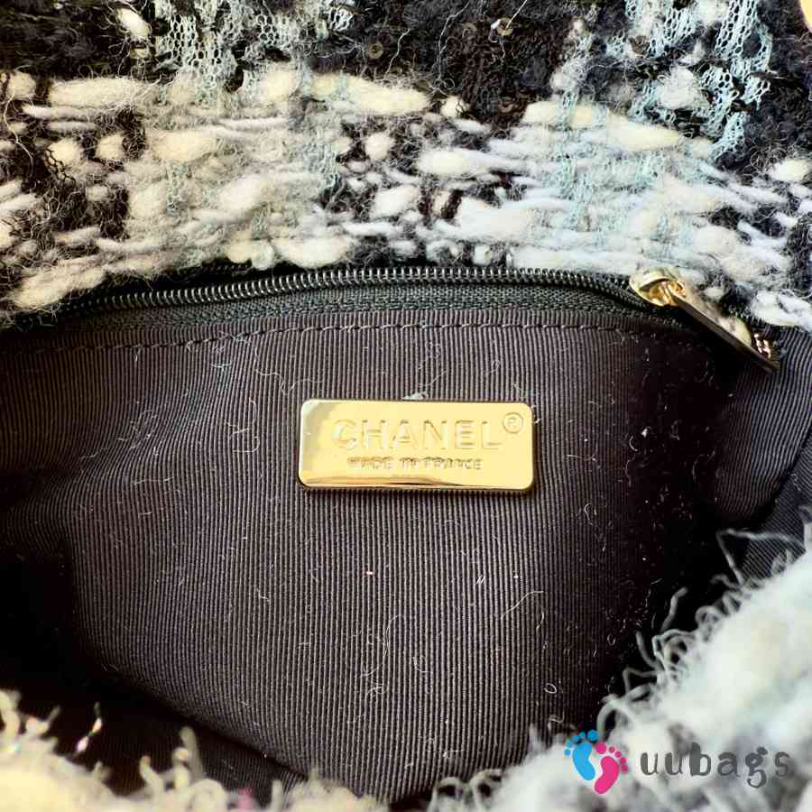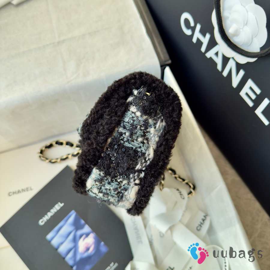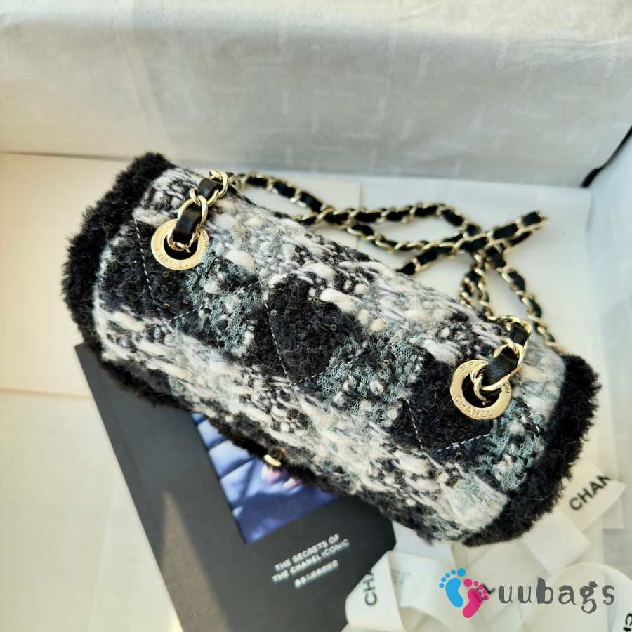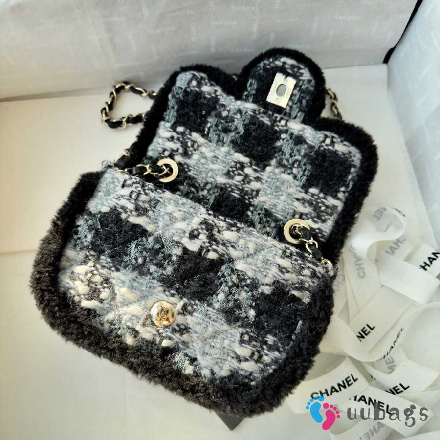Uubags Chanel Small Flap Bag Tweed, Shearling Lambskin & Gold-Tone Metal In Black & Grey 20cm