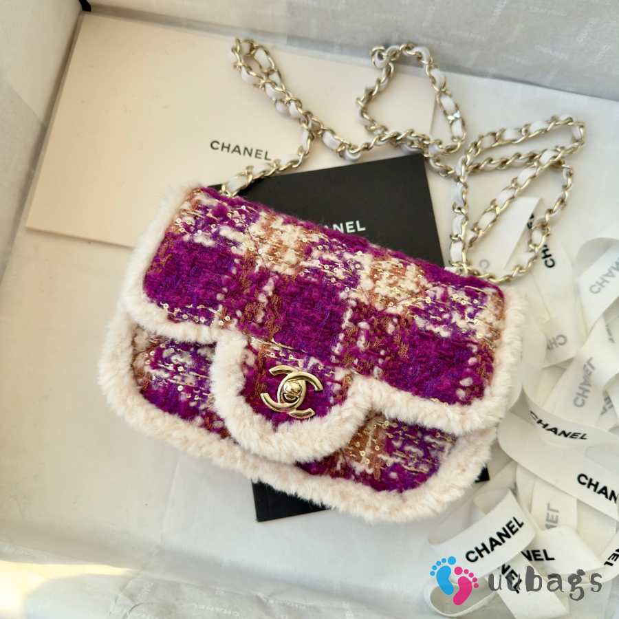 Uubags Chanel Small Flap Bag Tweed, Shearling Lambskin & Gold-Tone Metal In Black & Grey 20cm