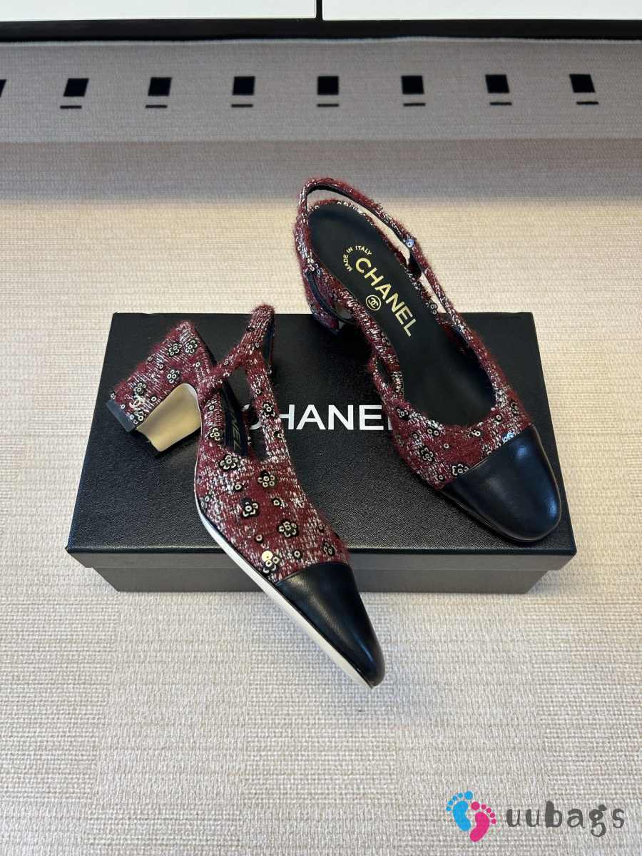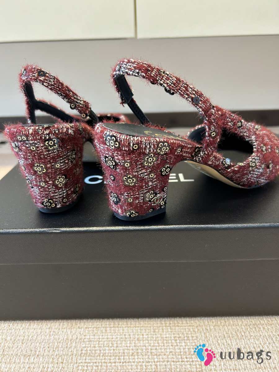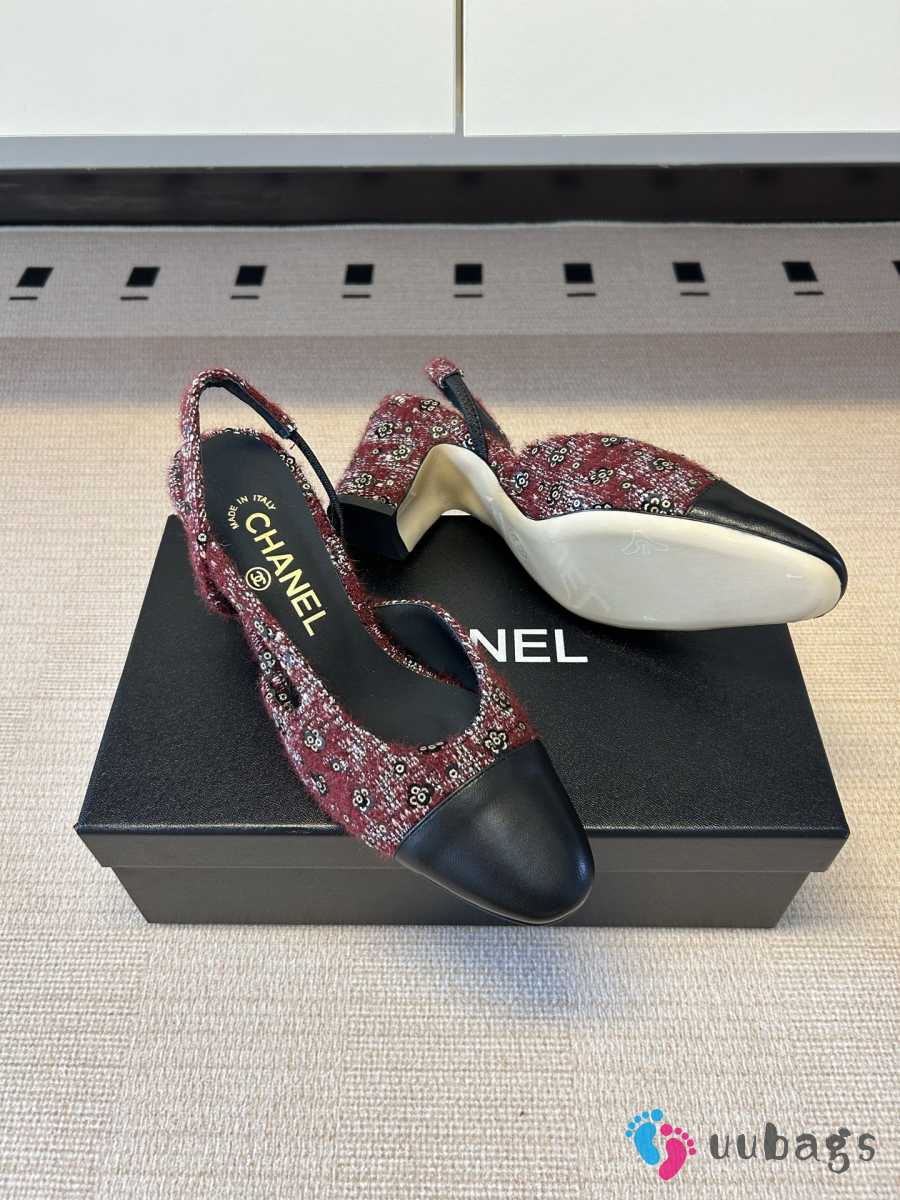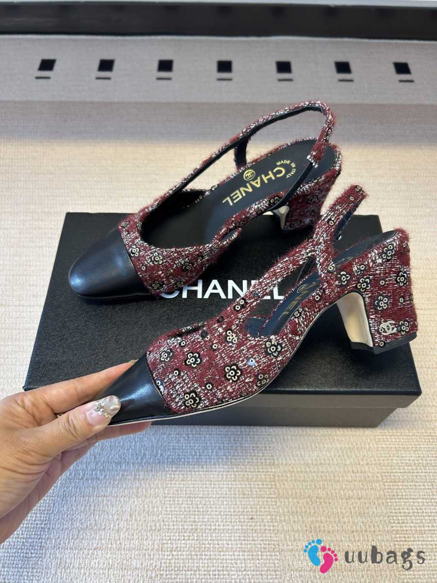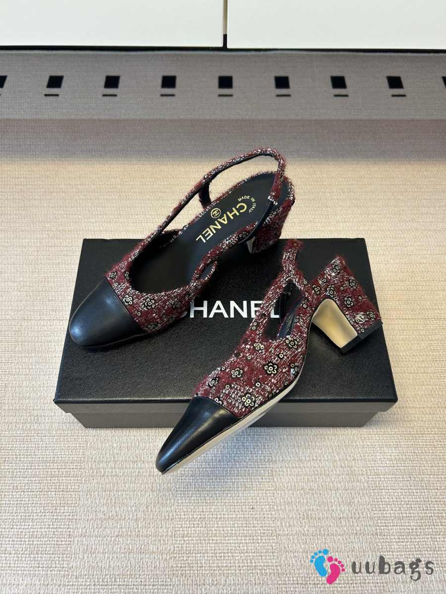 Uubags Chanel Tweed Slingback Pumps with Camellia Motif – Burgundy Tweed & Black Cap Toe