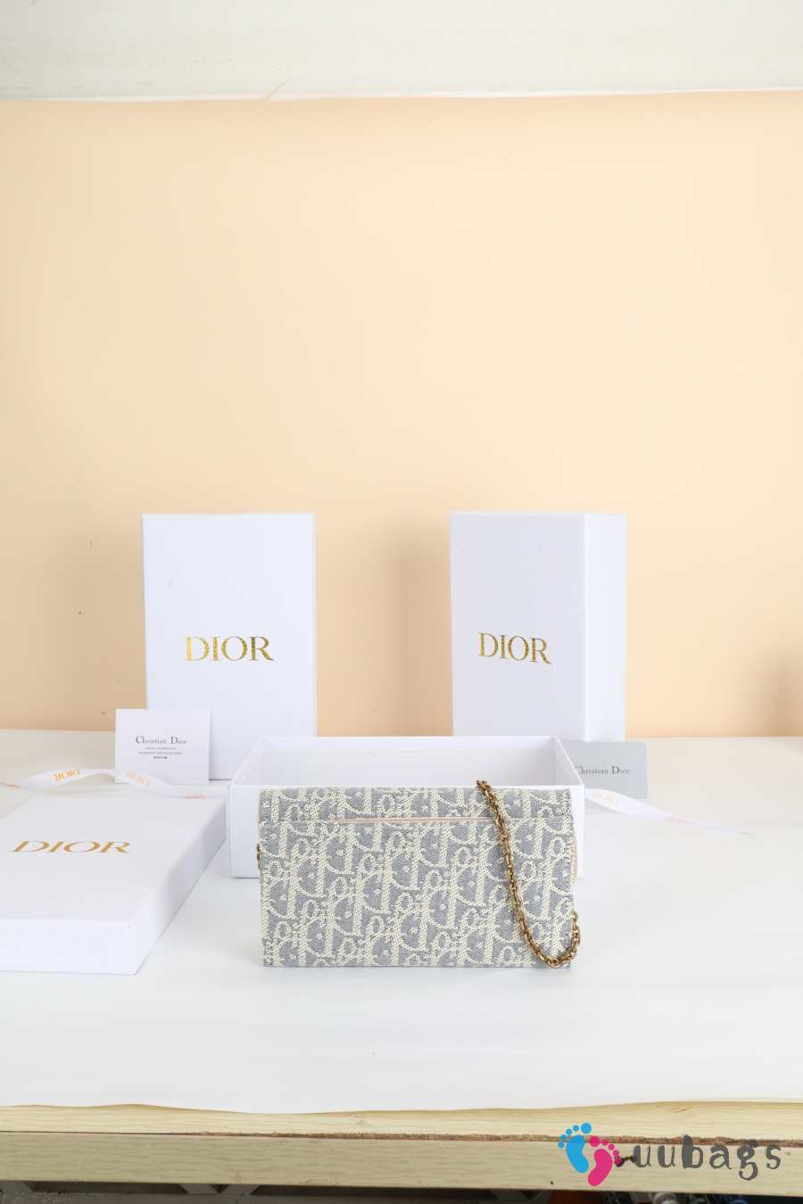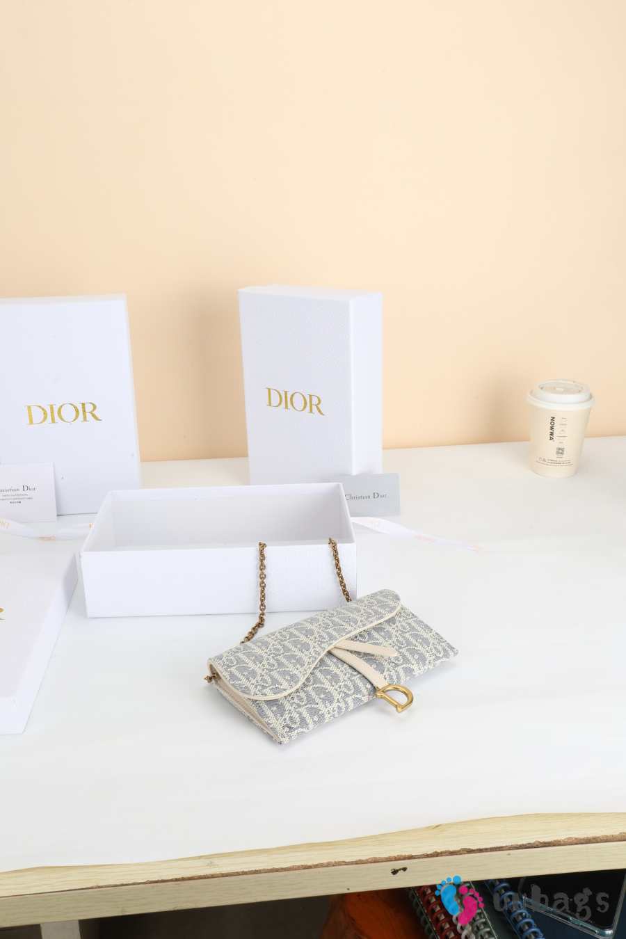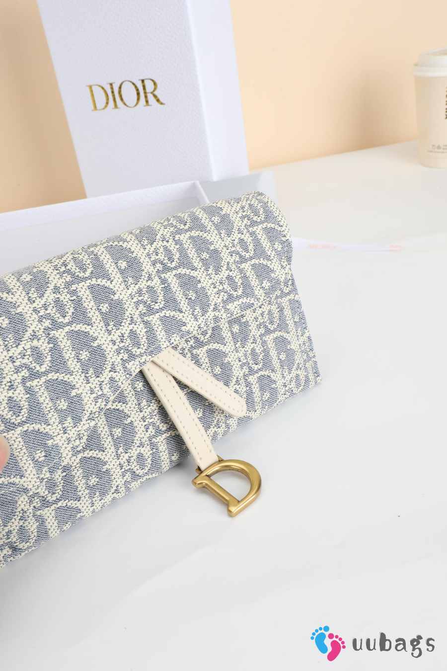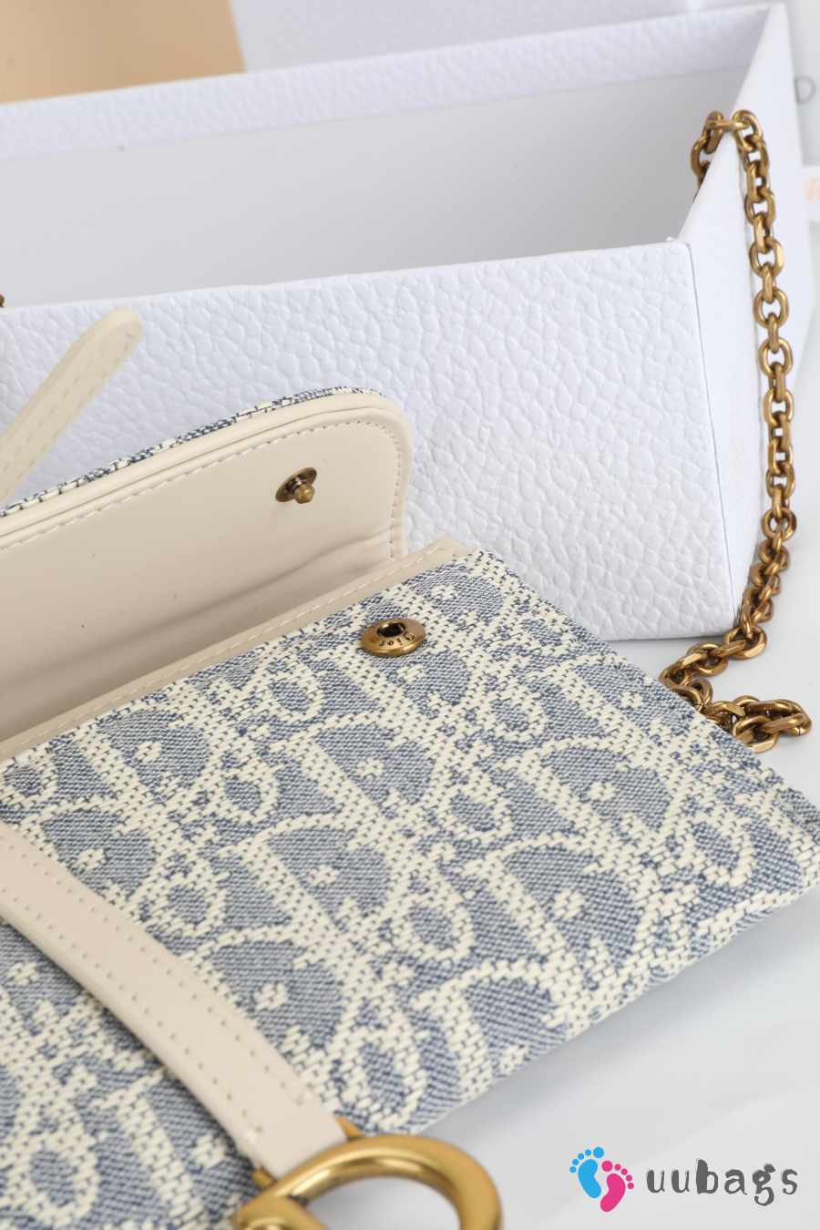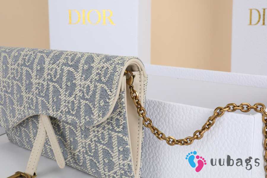 Uubags Dior Saddle Long Wallet With Chain In White & Grey Dior Oblique Jacquard 19x9.5x3cm