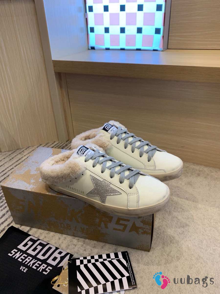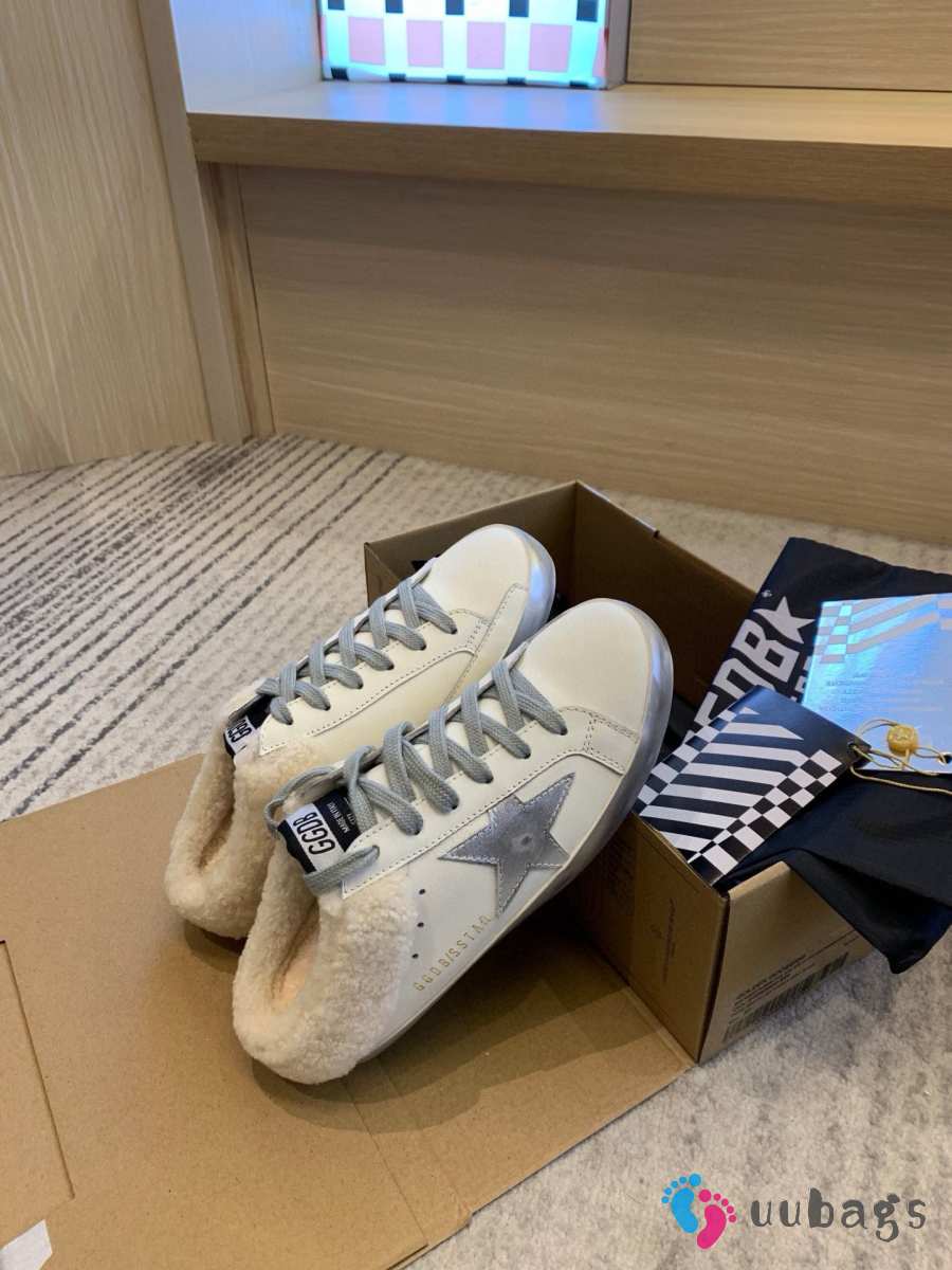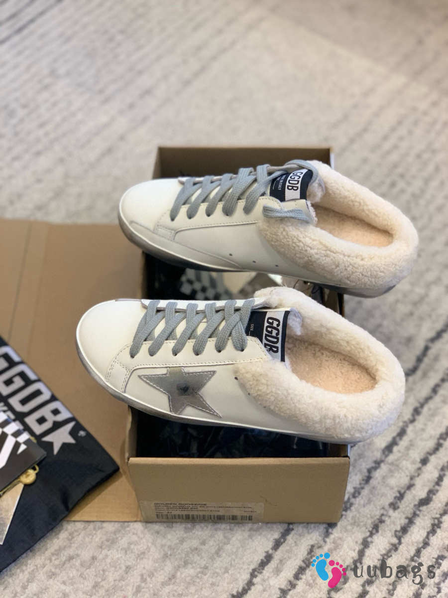 Uubags Golden Goose Ball Star Sabots in white nappa with platinum star and shearling lining