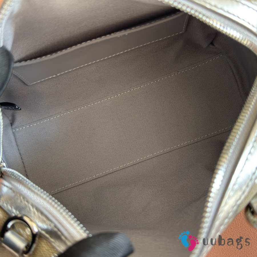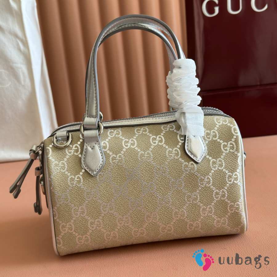 Uubags Gucci GG Emblem small boston bag in light beige and metallic silver laminated-effect GG Monogram coated fabric 20.5x14x11.5cm