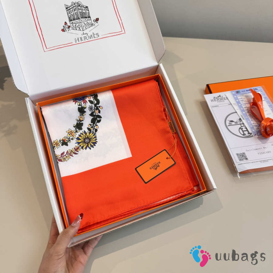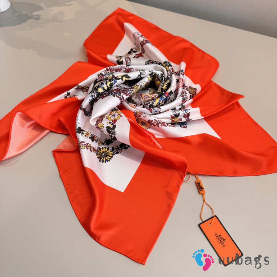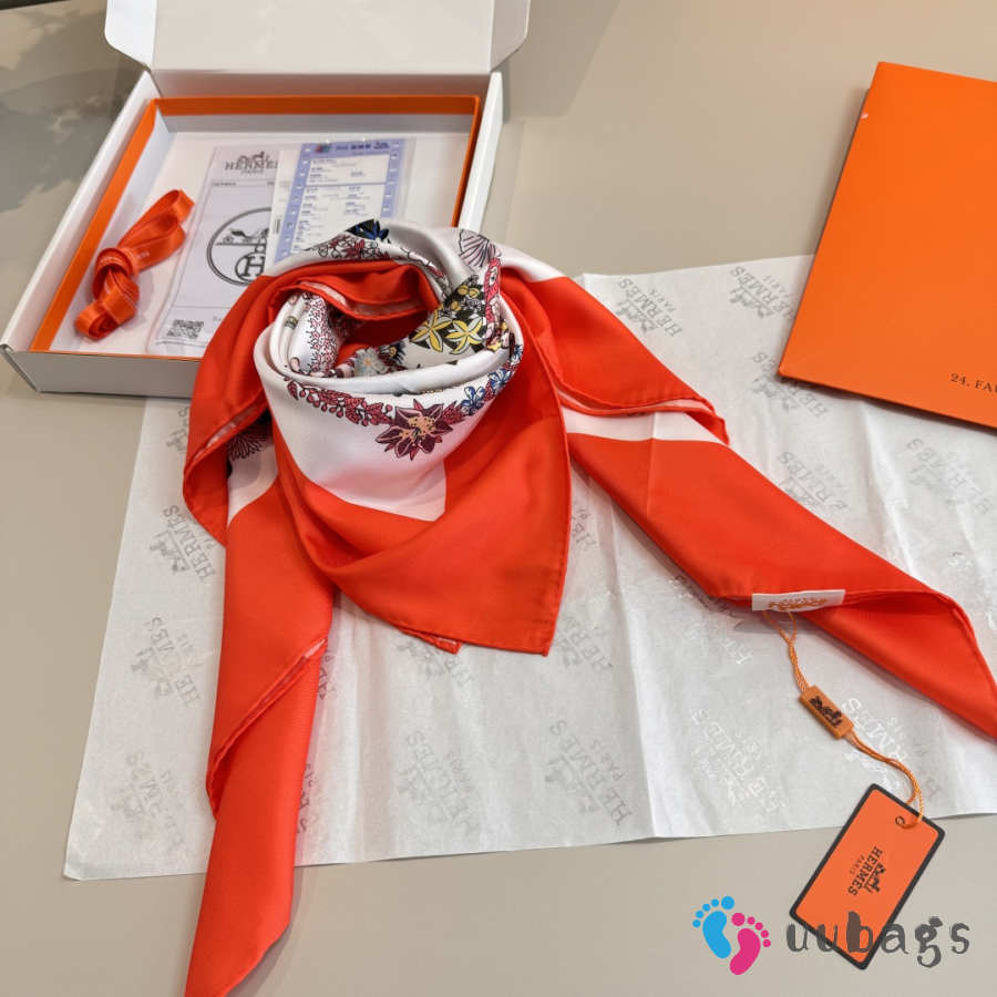 Uubags Hermes scarf in silk twill with hand-rolled edges bright orrange/ beige/ multicolored 88.5x88.5cm