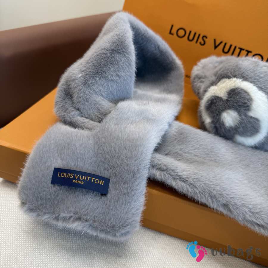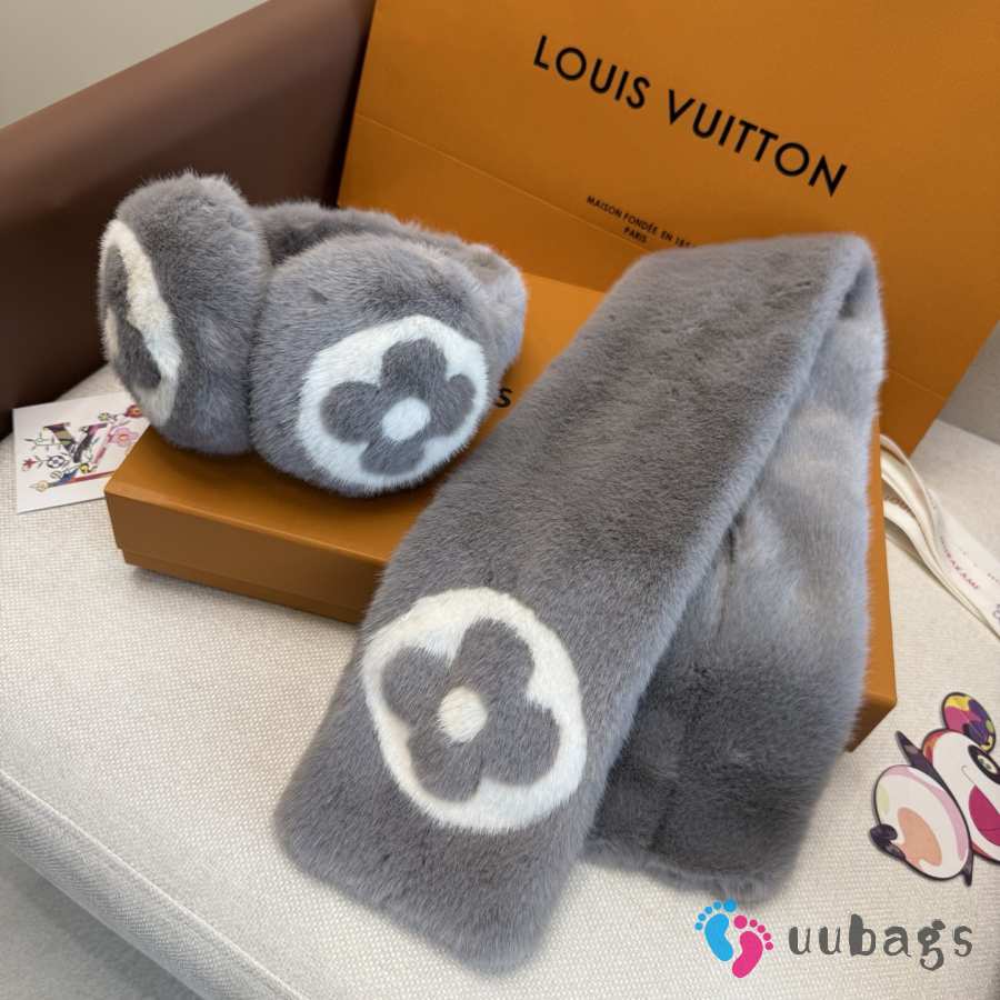 Uubags Louis Vuitton Earmuffs & Fur Scarf Set Monogram Flower Grey shearling
