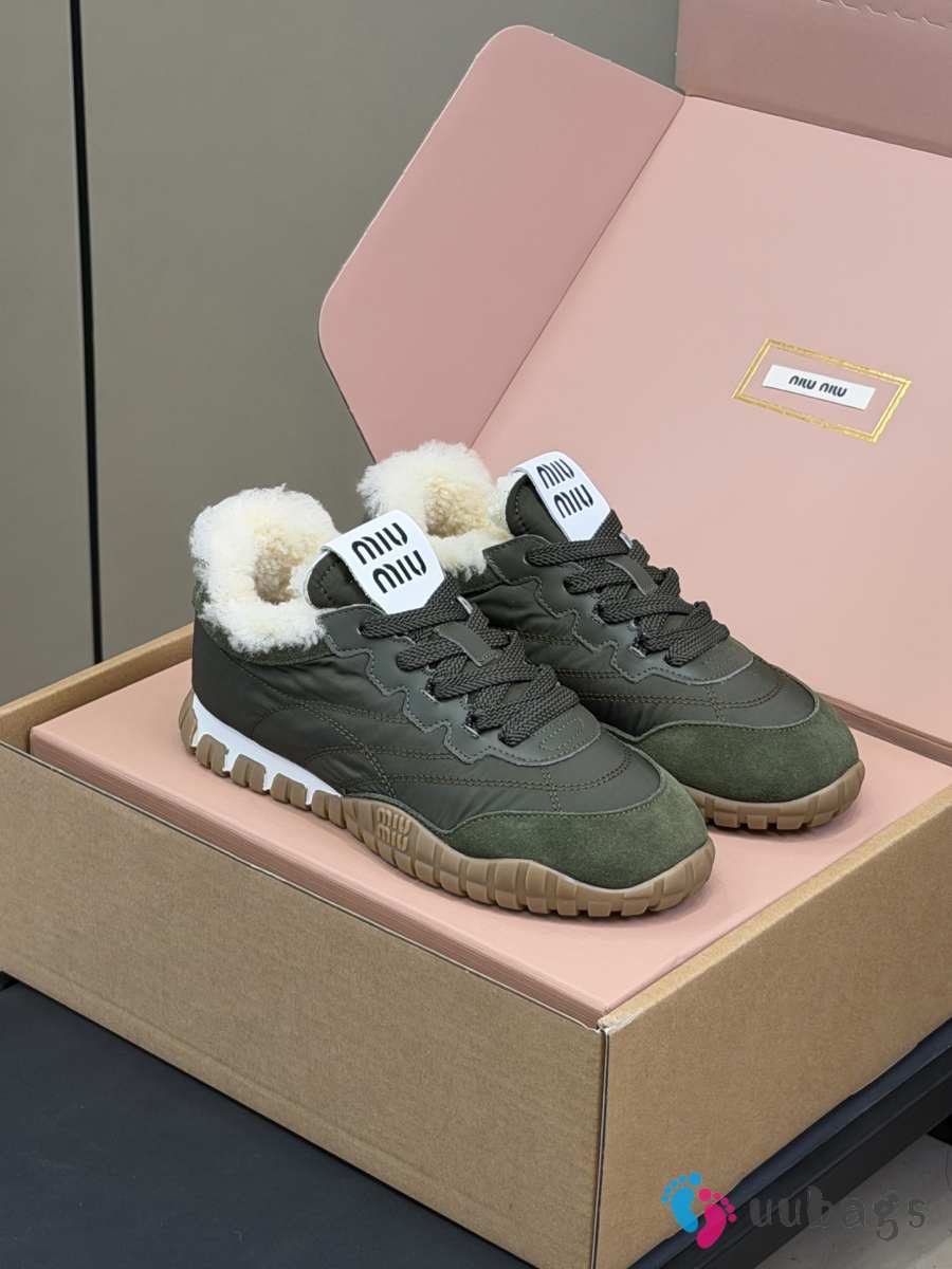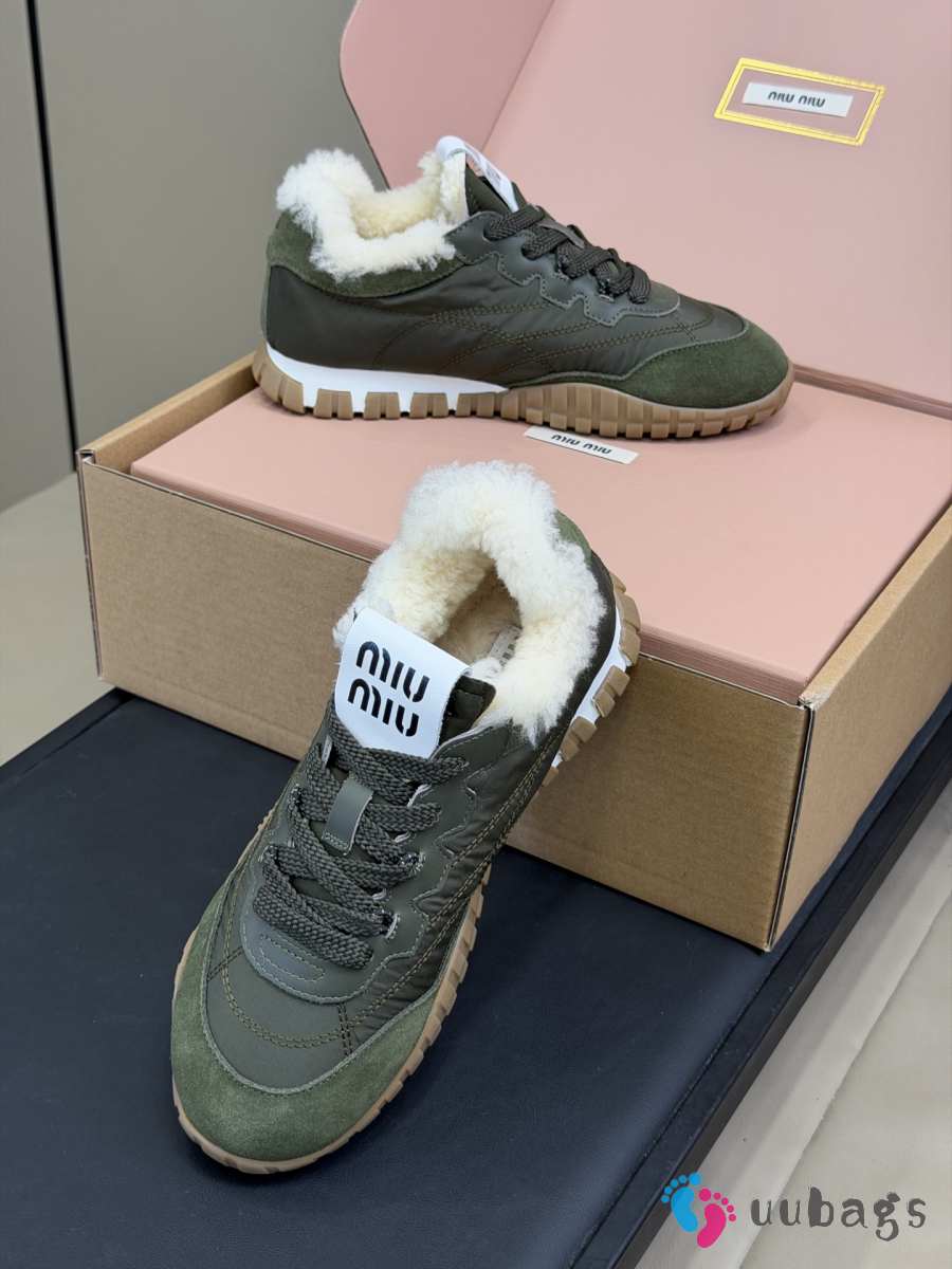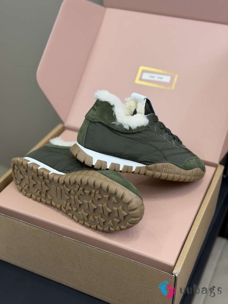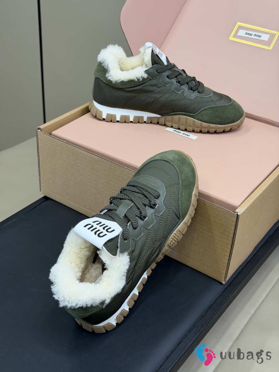 Uubags Miu Miu Leather and Shearling Sneakers Khaki Green