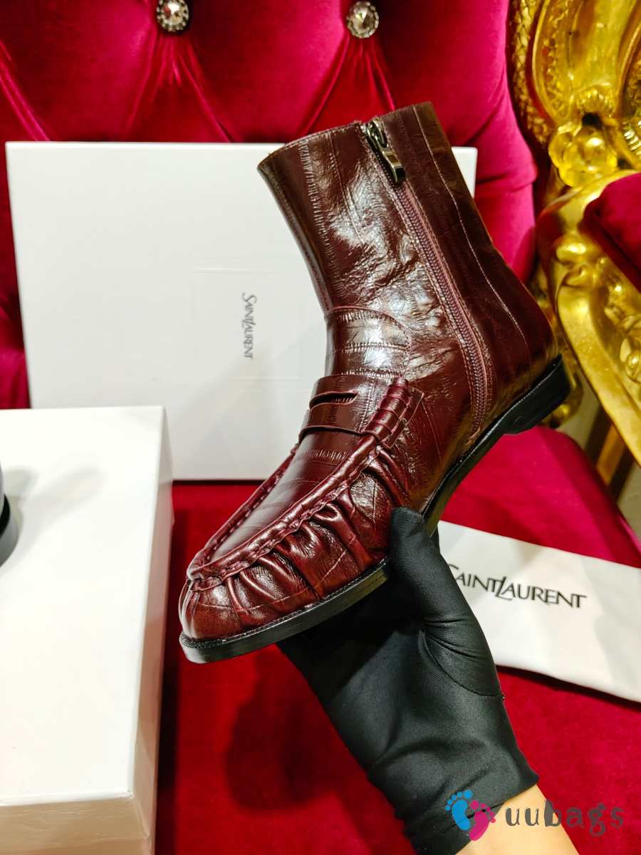 Uubags YSL Patent Croc-Embossed Penny Loafer Ankle Boots In Burgundy